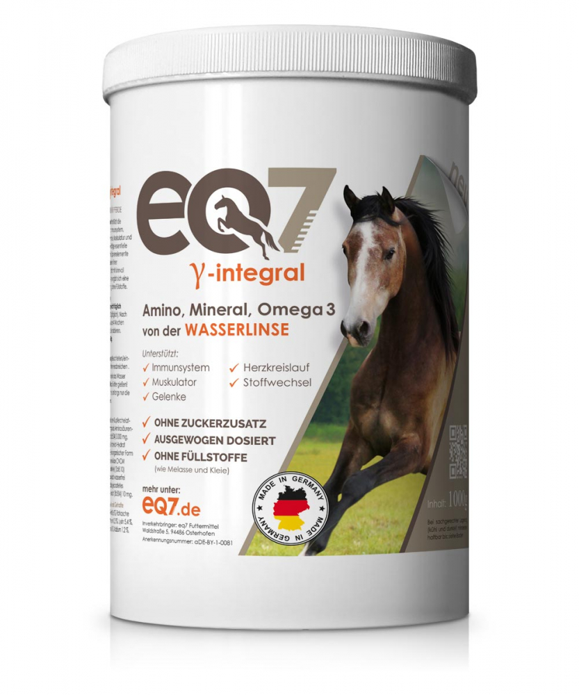 eQ7 ?-integral versorgt dein Pferd mit genau den Mineralien und Spurenelementen, die dem Heu fehlen. Es füllt diesen ungedeckten Bedarf auf und liefert zusätzlich viele natürliche Vitamine und sekundäre Pflanzenstoffe. Dabei belastet es den Organismus nicht mit einem Überangebot an künstlichen Zusatzstoffen. Die Wasserlinse ist außerdem reich an sehr hochwertigen Aminosäuren und Omega 3 Fettsäuren, wodurch auch Muskelaufbau, Herz-Kreislauf und Immunsystem optimal gefördert werden.